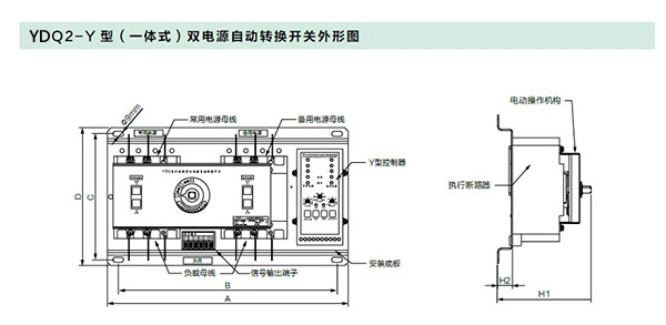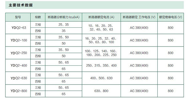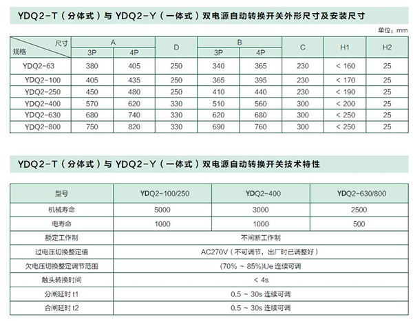 YDQ2 智能型系列雙電源自動轉(zhuǎn)換開關(guān)是由兩臺三極或四極的塑殼斷路器及其附件( 輔助、報警觸頭)、機械聯(lián)鎖傳動機構(gòu)、智能控制器等組成。適用于交流50Hz、額定工作電壓AC400V、額定工作電流至800A 的雙電流供電系統(tǒng),能實現(xiàn)常用電源(N)與備用電源(R)之間的自動轉(zhuǎn)換,也能實現(xiàn)手動切換。