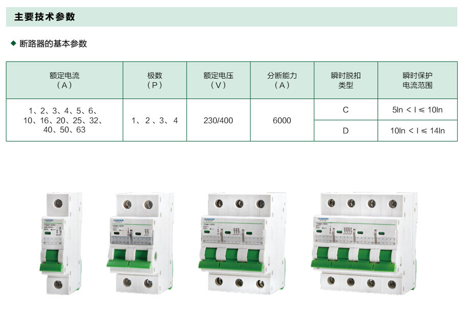 YDM1-63H 系列小型斷路器主要適用于交流50Hz/60Hz,額定工作電壓為230V/400V 及以下,額定電流至63A 的電路中,該斷路器主要用于現(xiàn)代建筑電氣線路中設(shè)備的過載、短路保護(hù),亦適用于在正常情況下線路的不頻繁操作與隔離。
